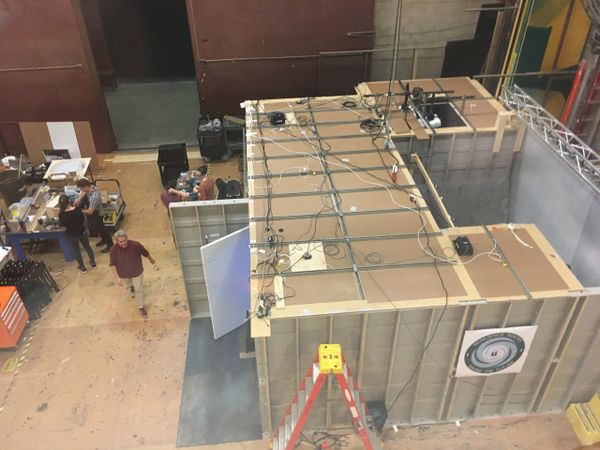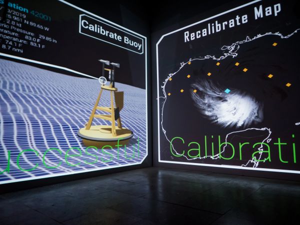 The VR projection room with the main portion of Puzzle 6 - recalibrating the buoys to send information about the impeding storm. [Picture Credit to Logan Smith.]