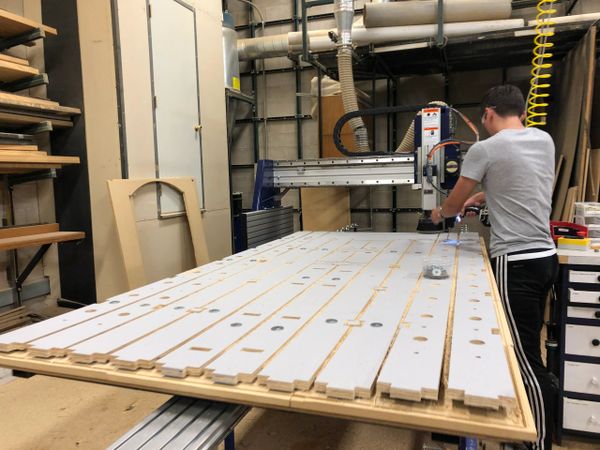 We then used a CNC router to cut the MDF and plywood sheets into ribs for our wall structure. [Picture Credit to Laura Godinez]